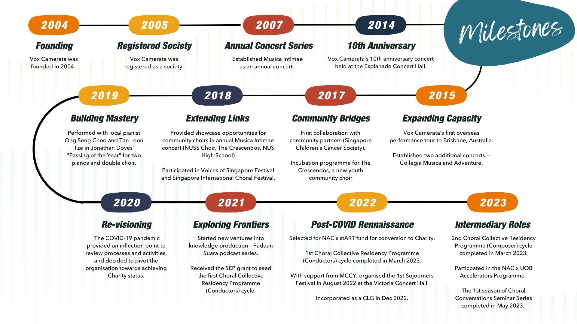 Vox Camerata Ltd is a Singapore-based arts non-profit that designs and delivers community-centred programmes through the performing arts and community engagement. Our work brings people together across cultural, social, and faith boundaries, creating spaces for dialogue, learning, and collaboration.